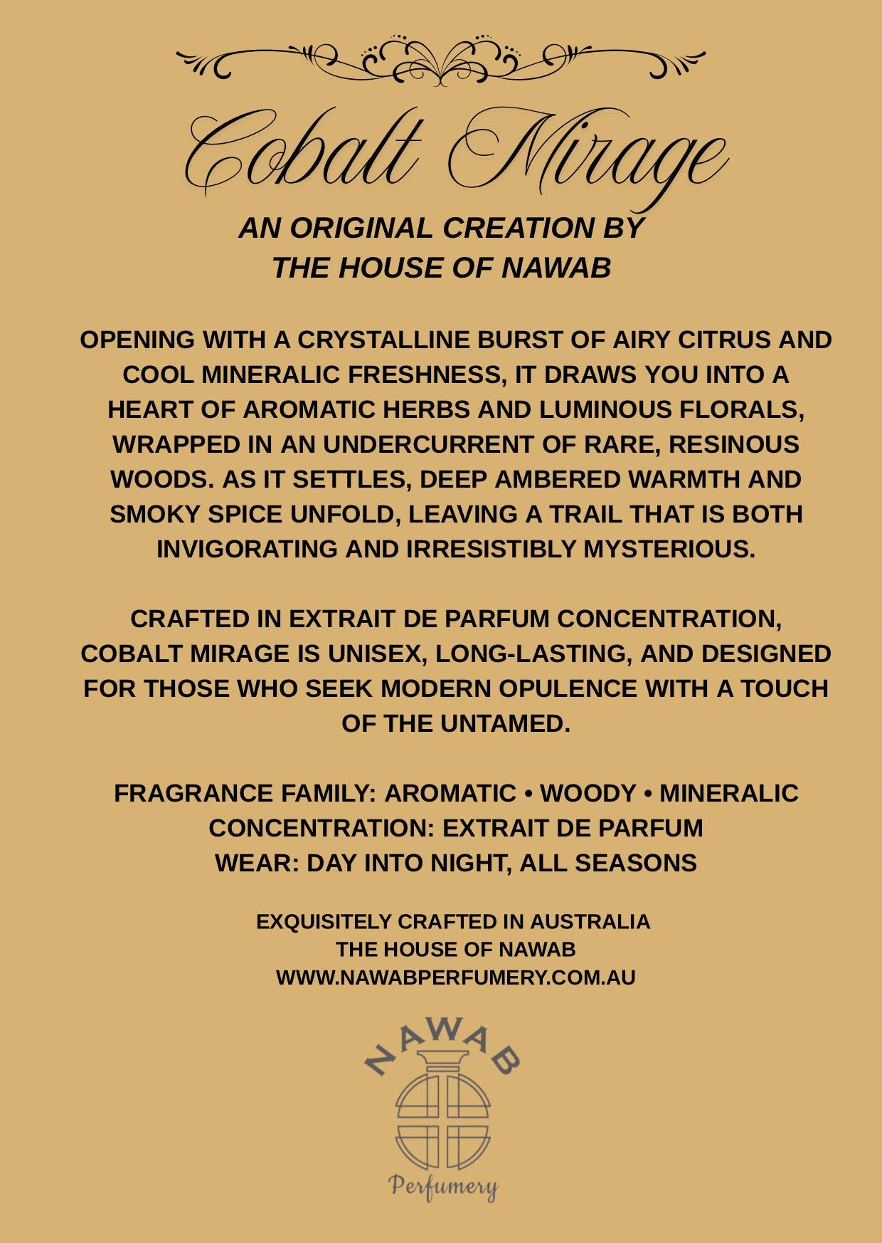 Crafted in extrait de parfum concentration, Cobalt Mirage is unisex, long-lasting, and designed for those who seek modern opulence with a touch of the untamed.